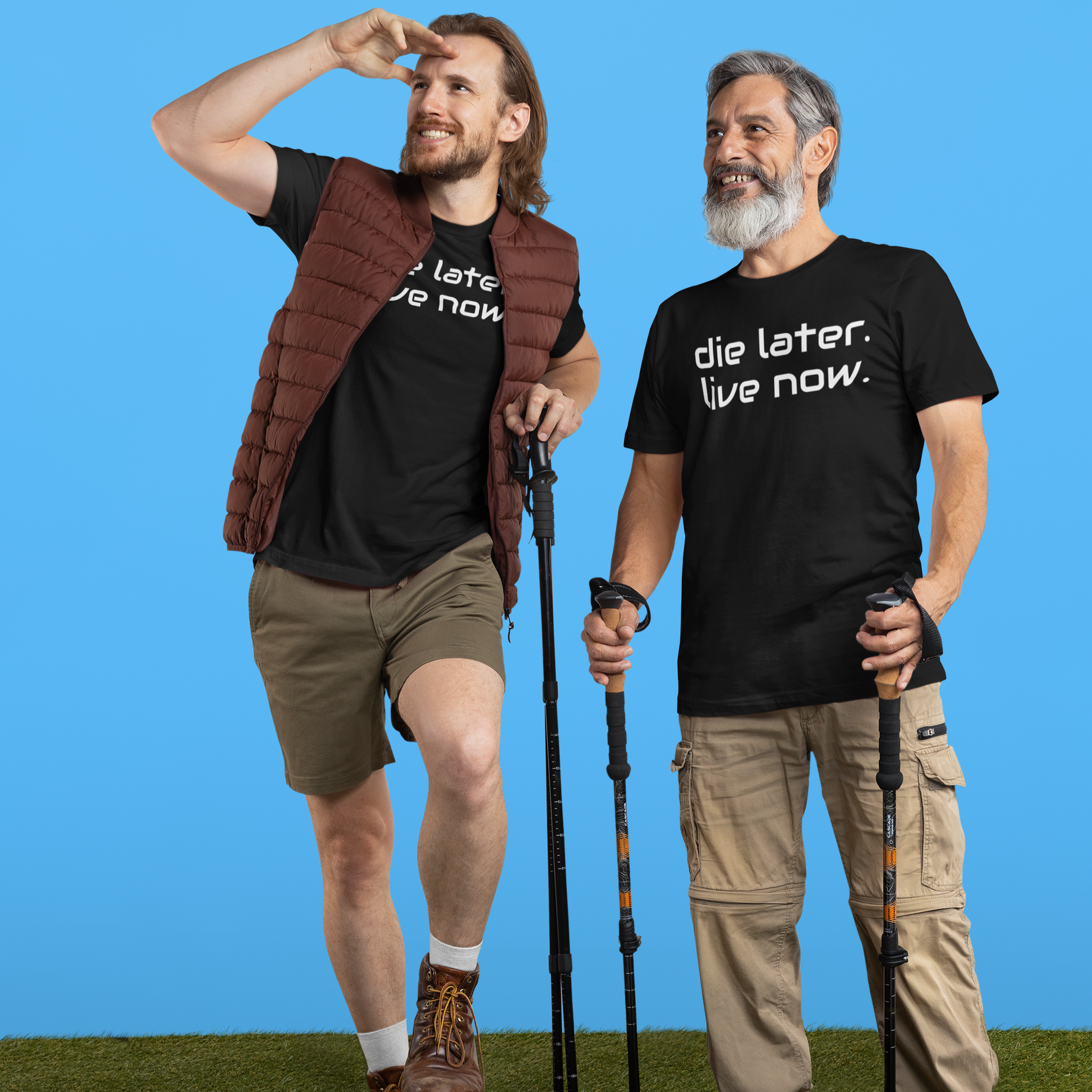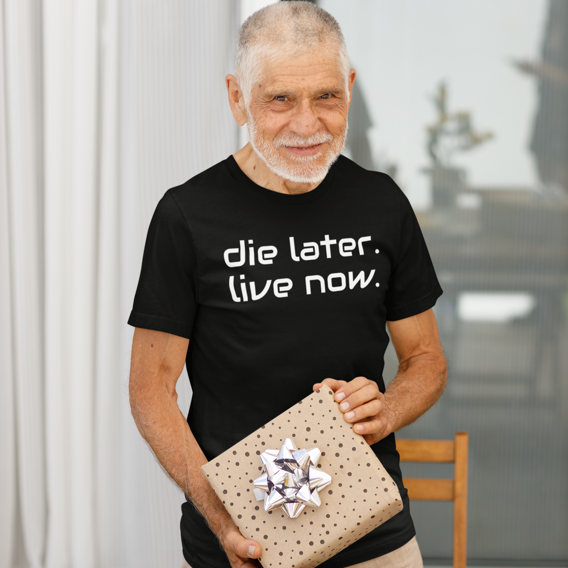 Embrace the moment with our "Die Later. Live Now." T-shirt. Bold, thought-provoking, and inspiring, this design encourages you to seize the day and live life to its fullest. Made from premium, soft fabric, it’s perfect for anyone who believes in making every moment count. Carpe Diem!