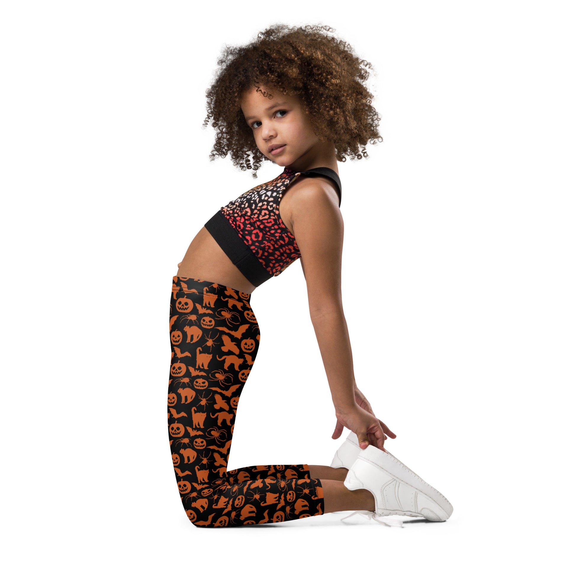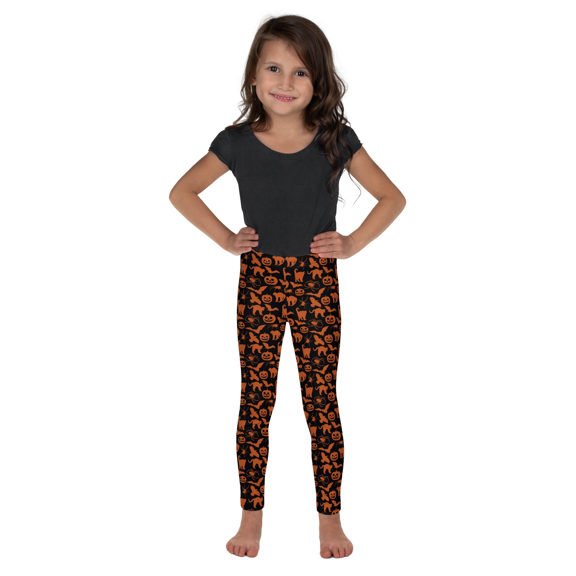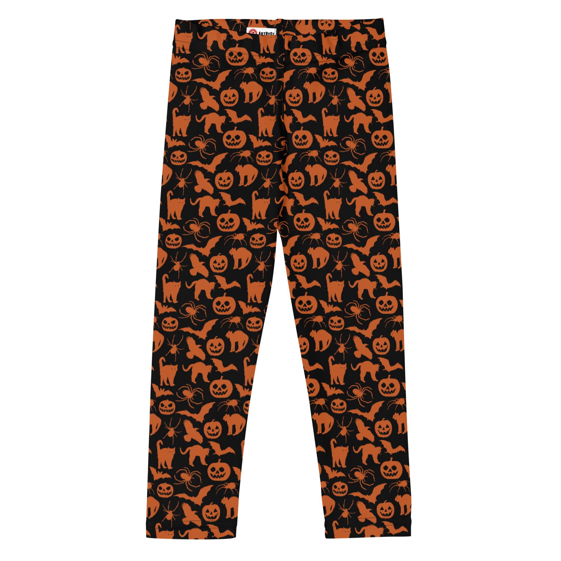 Halloween Mix 2 of bats, cats, pumpkins, and spiders on orange and black soft kids leggings with an elastic waistband are just perfect for active youngsters. The graphics will never lose their color intensity, so they can feel free to get messy in these leggings.