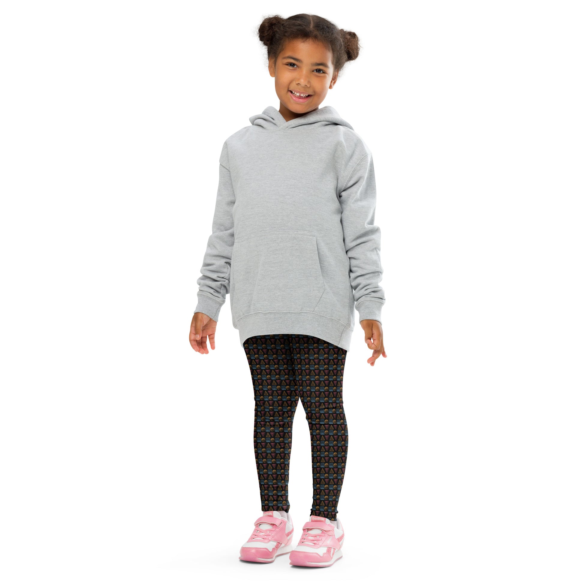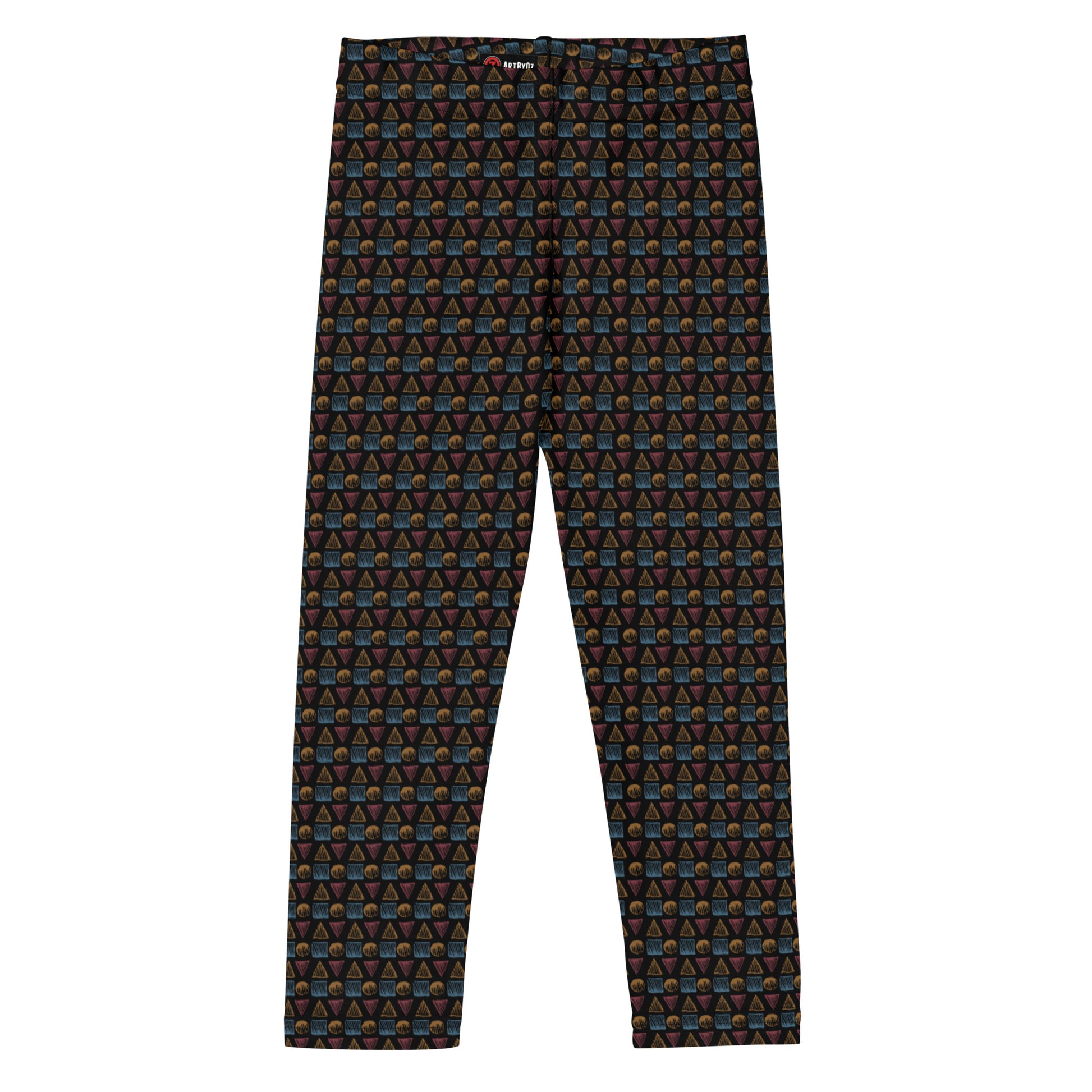 A unique pattern of squares, triangles, and circles on a black background makes these leggings for kids a must have!
