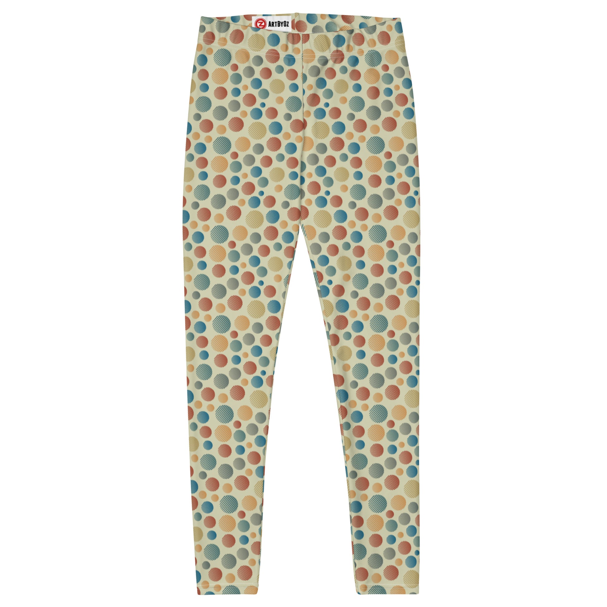 Polka dots pattern design taken to the next level. Hatched dots in multiple colors on a pale yellow background. Printed on super comfy high waisted leggings with pockets. Printed and hand sewn with love.