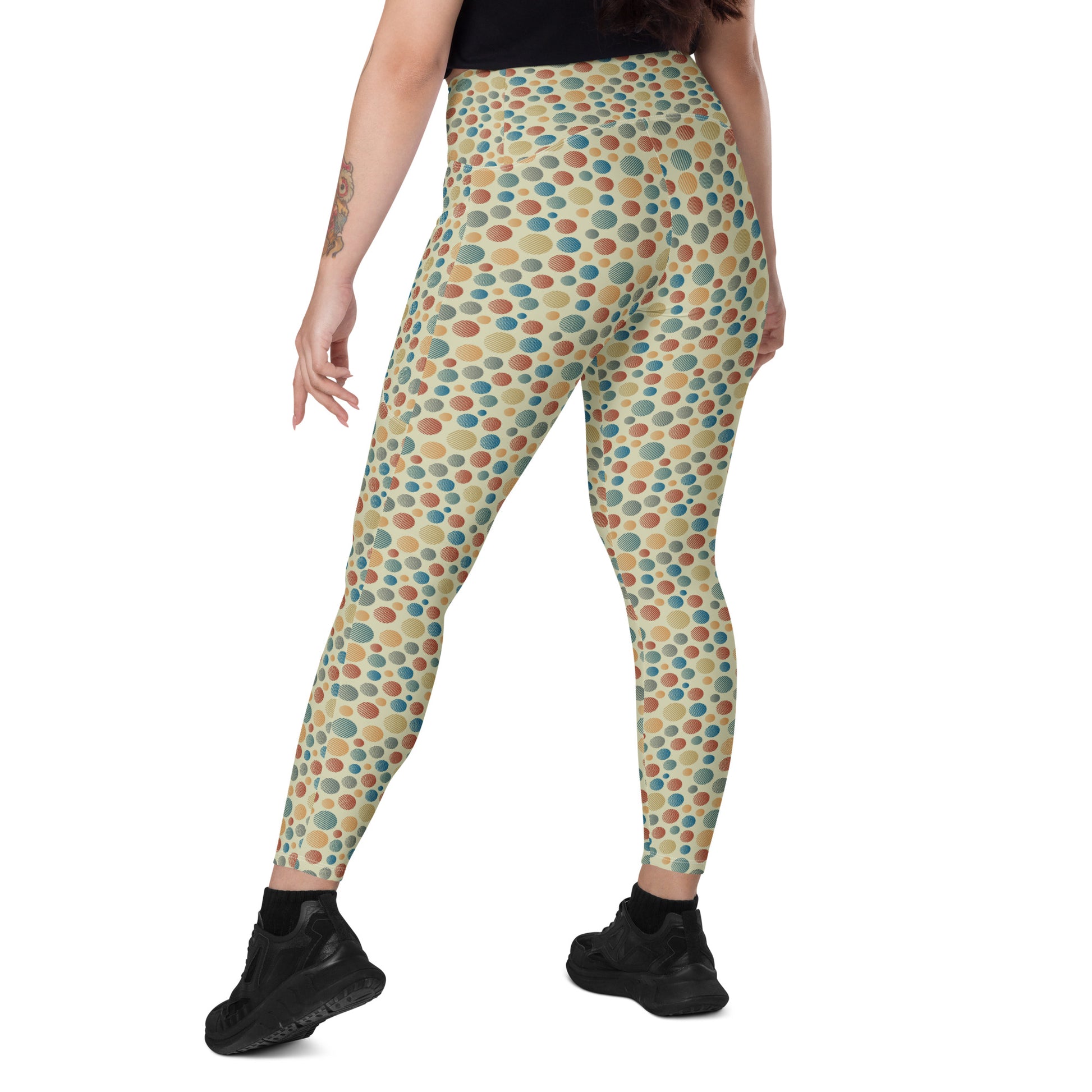 Polka dots pattern design taken to the next level. Hatched dots in multiple colors on a pale yellow background. Printed on super comfy high waisted leggings with pockets. Printed and hand sewn with love.