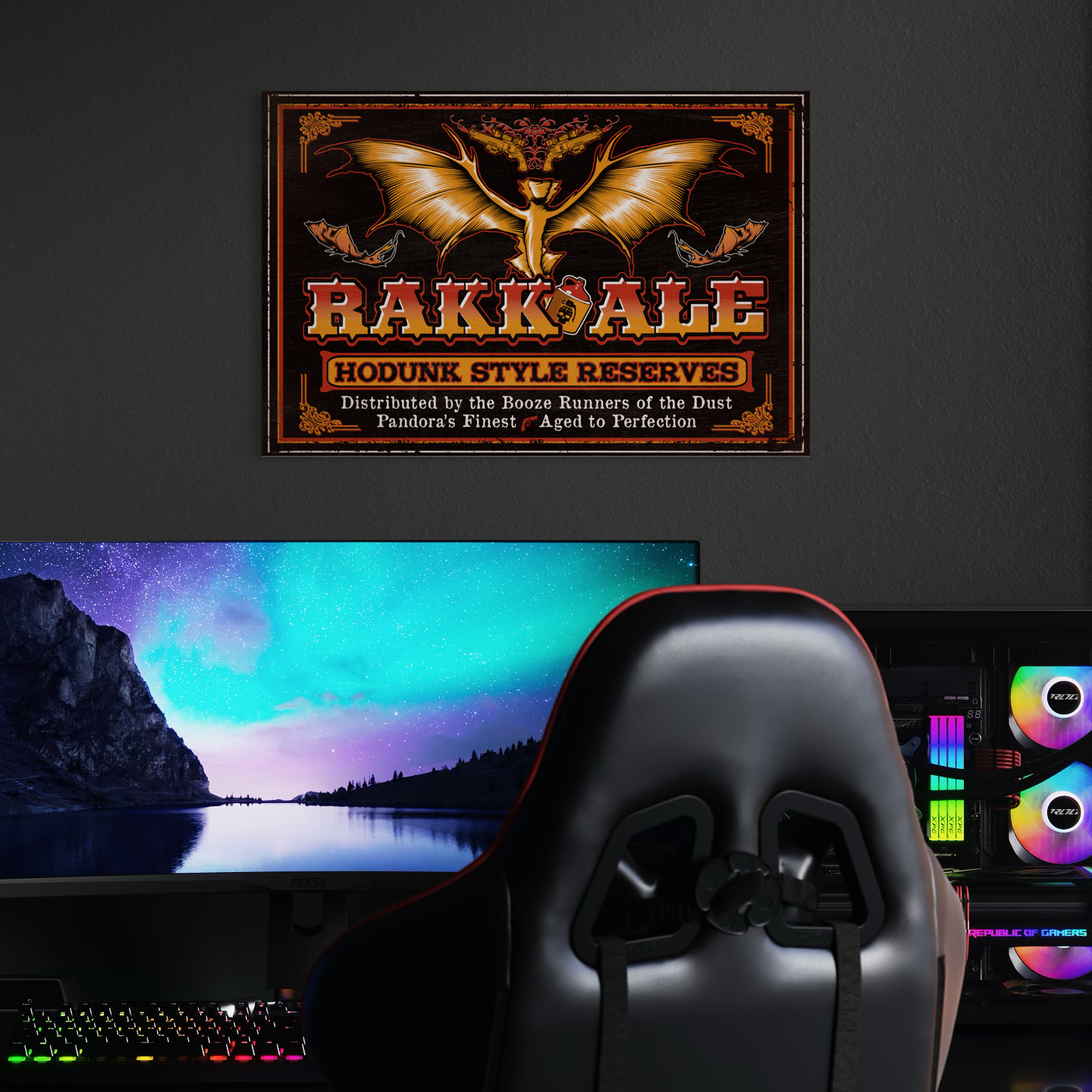 Rakk Ale is distributed by the booze runners of the dust. Pandora's finest and aged to perfection. Original fan art from the Borderlands game. Rakk Ale Metal Print. 16x24"