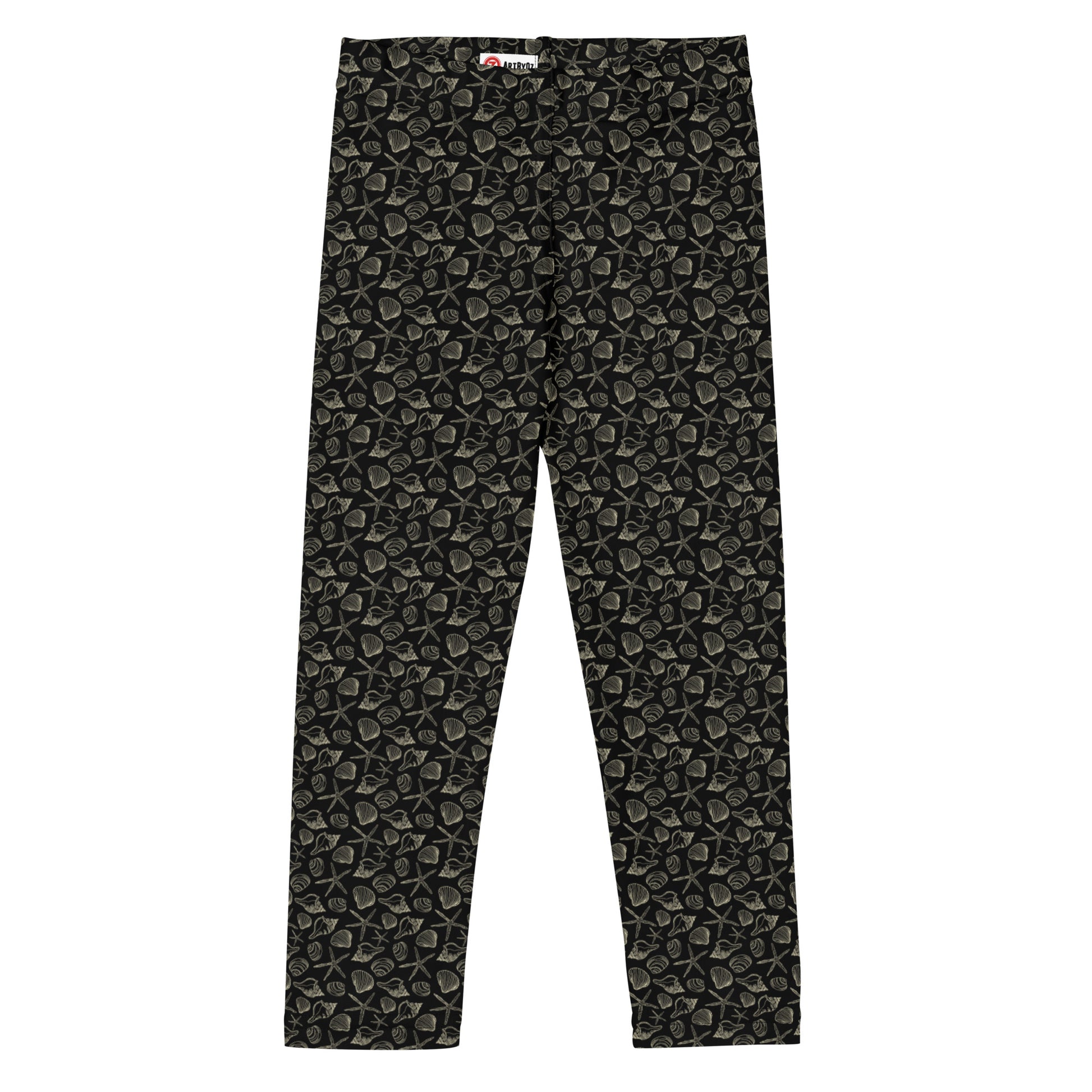 Sally's Seashells is a tossed pattern on a black background. The seashells have a stencil like outline. These soft kids leggings with an elastic waistband are just perfect for active youngsters. The graphics will never lose their color intensity, so they can feel free to get messy in these leggings. Take the beach home with you!