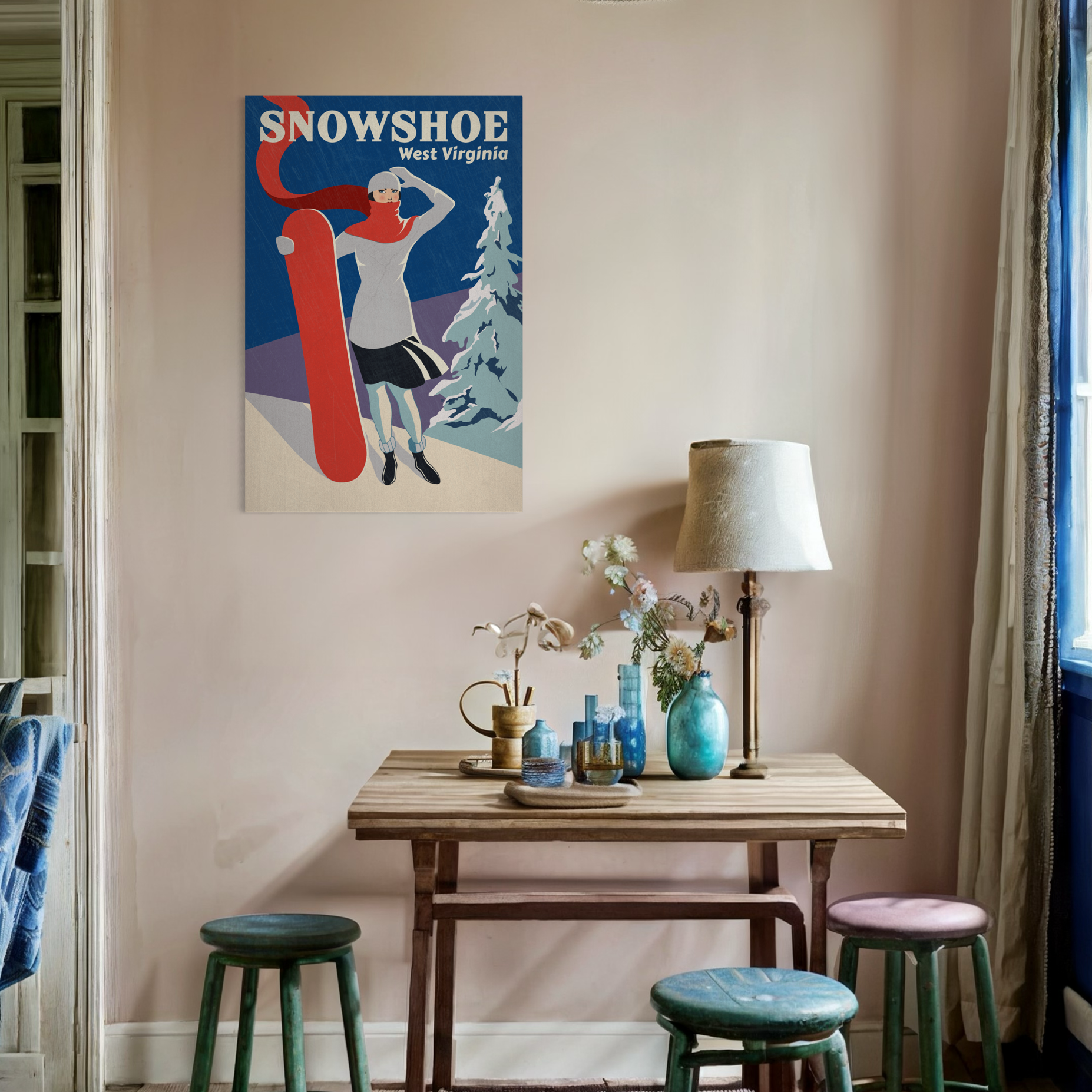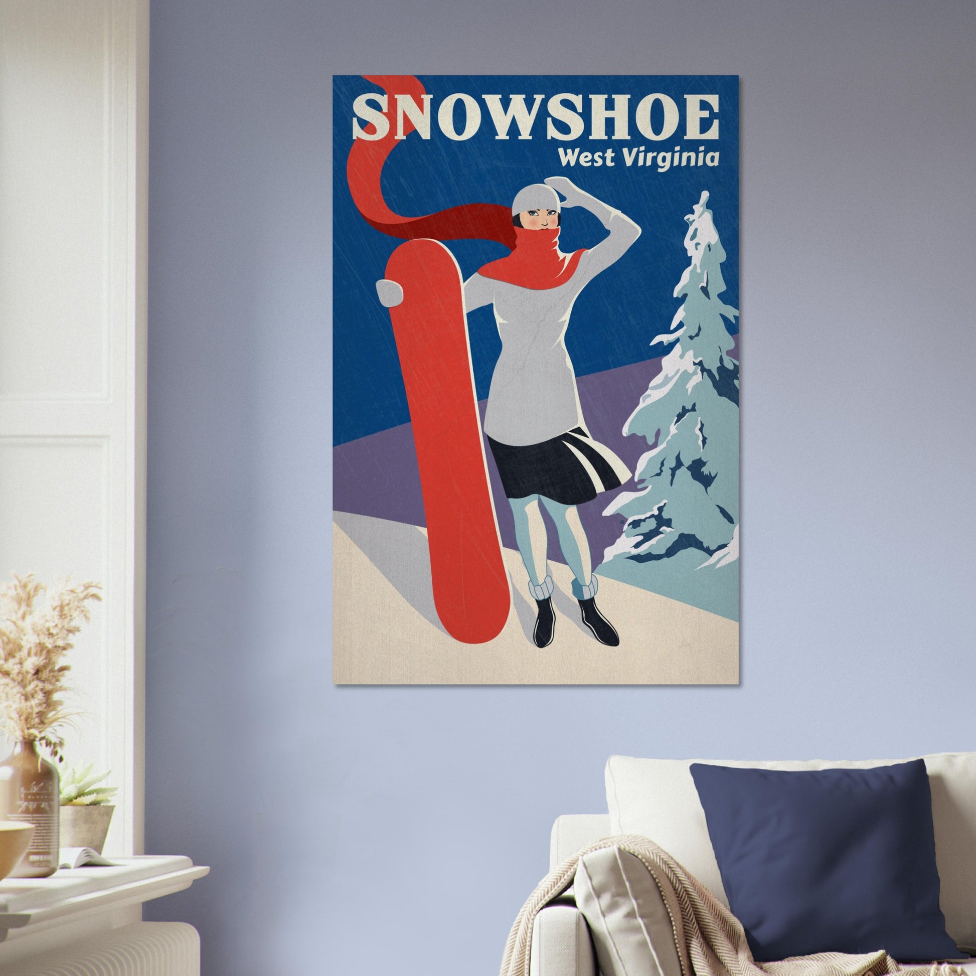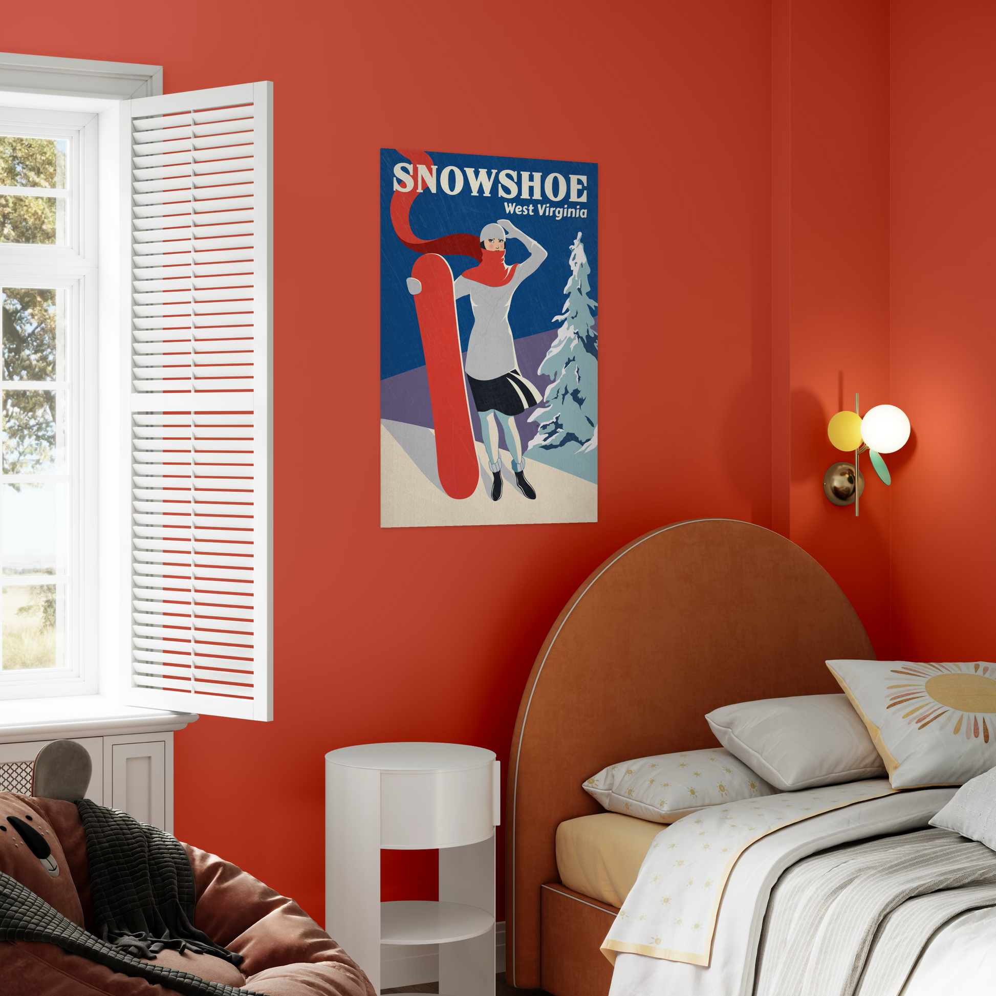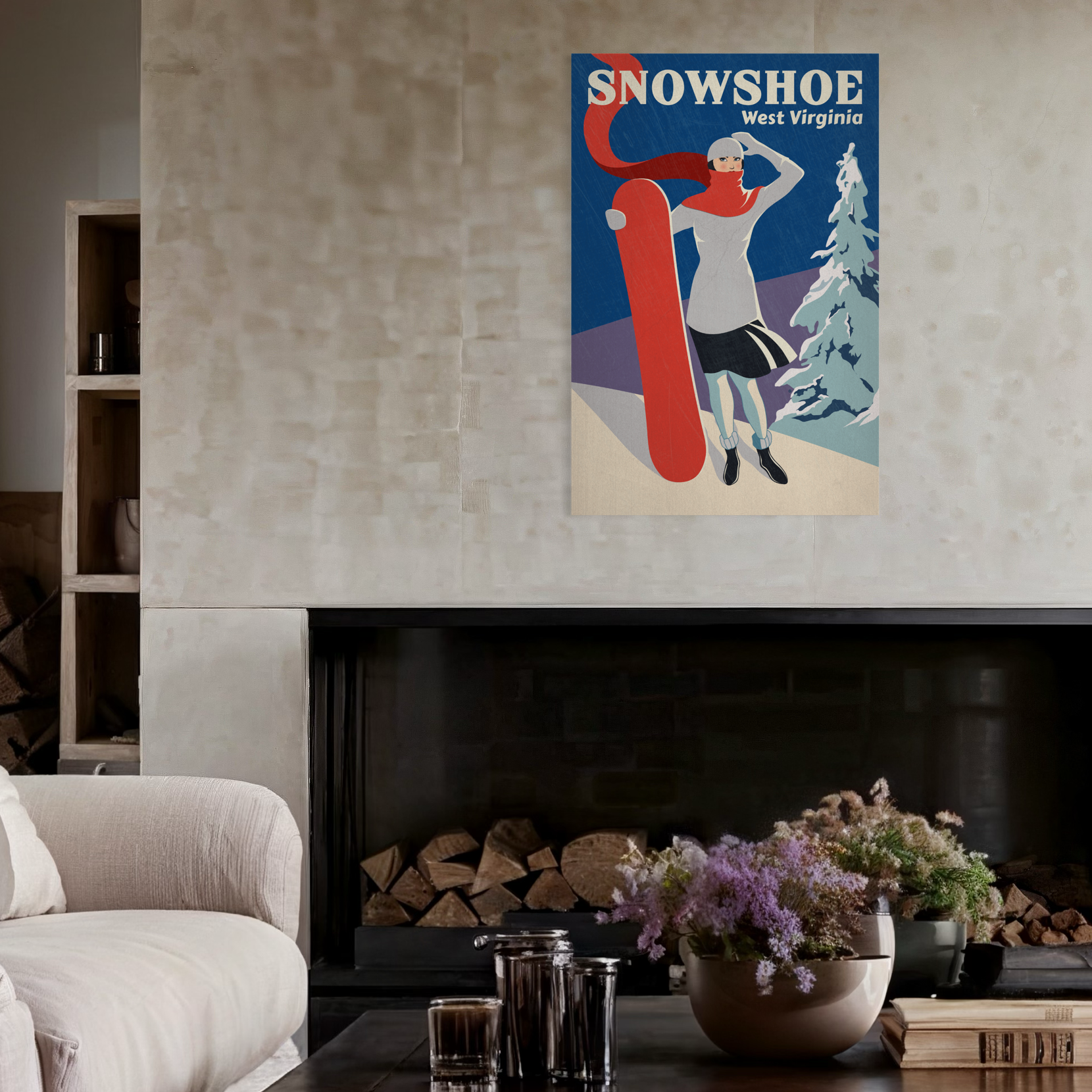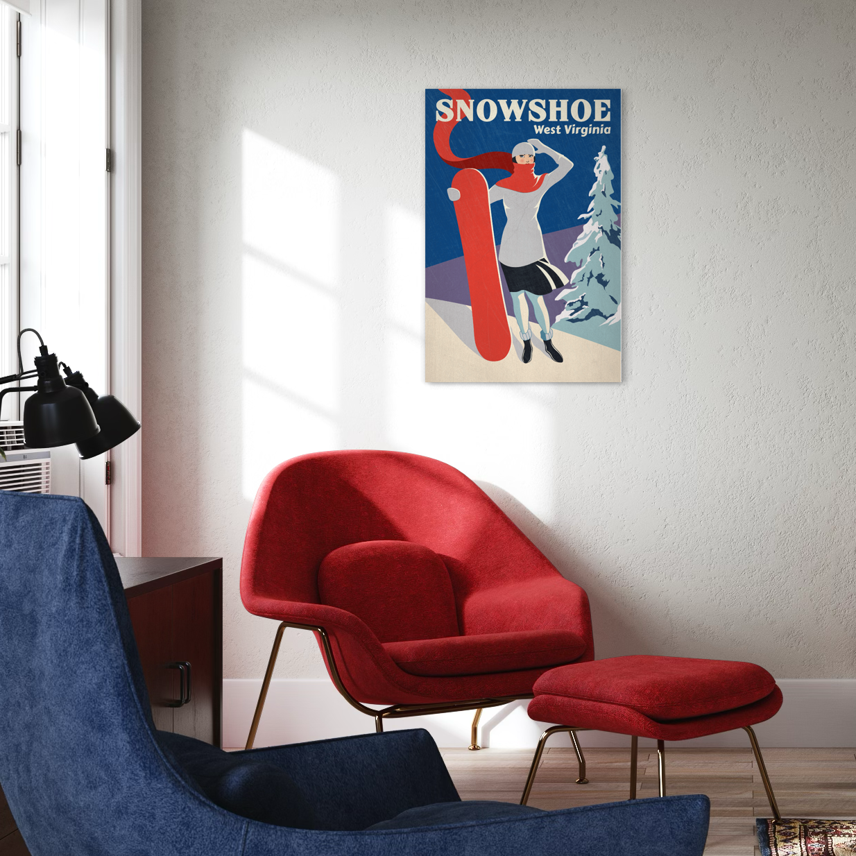 Snowboard design inspired by vintage European resort style designs. Part of the Snowshoe collection. Available in two sizes. Printed on Metal.