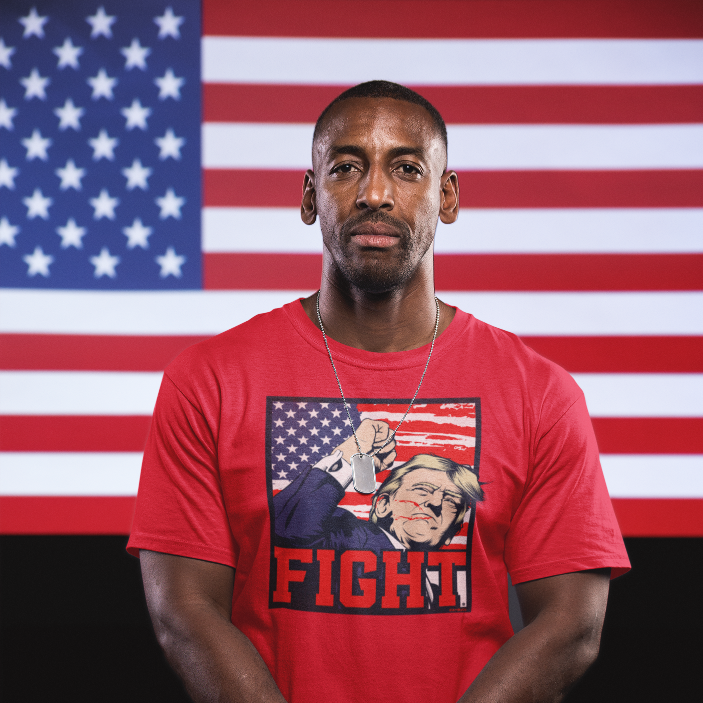 Trump Fights for you America!  Printed on super comfy Bella 3001 tees.